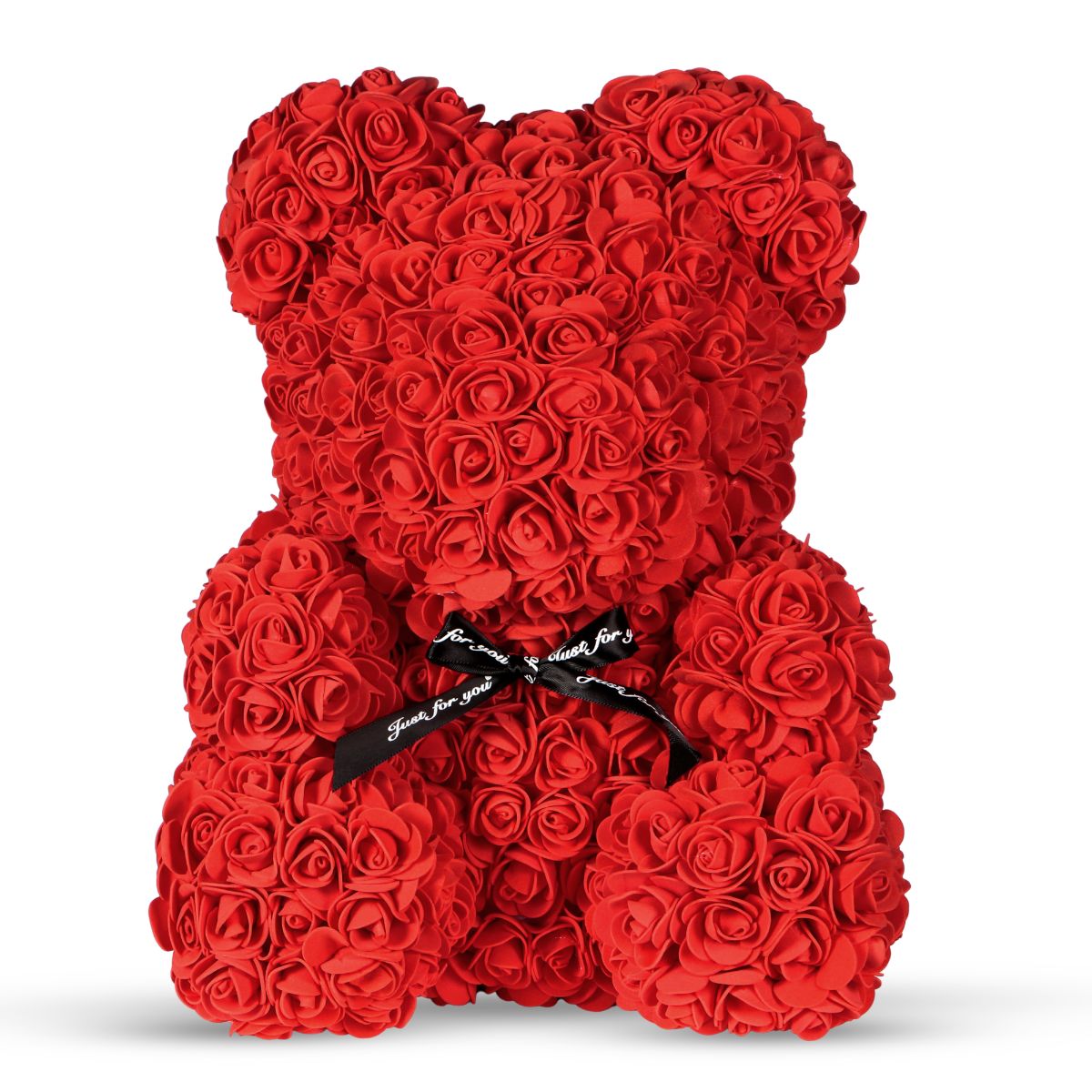 Our Rose Bears are meticulously crafted by arranging hundreds of synthetic roses onto a teddy bear-shaped form, creating a stunning floral display.